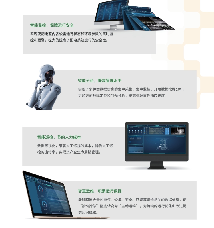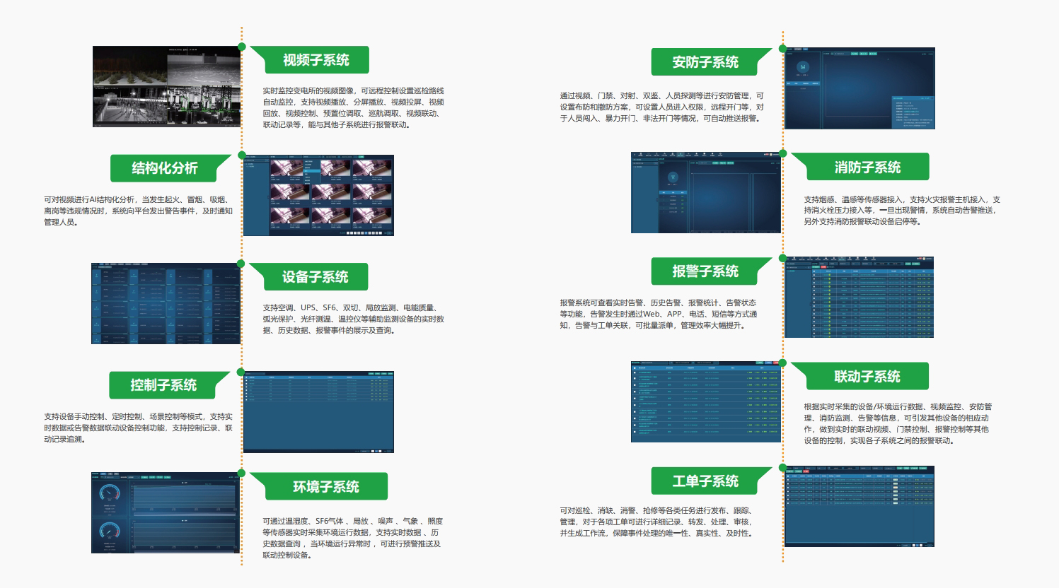 鐵路變電所輔助監(jiān)控系統(tǒng)包含視頻、設(shè)備、環(huán)境、安防、消防、報(bào)警、聯(lián)動(dòng)、工單子系統(tǒng),系統(tǒng)基于新一代人工智能、大數(shù)據(jù)分析技術(shù)、視頻結(jié)構(gòu)化分析技術(shù)等,對(duì)全站所主要電氣設(shè)備、關(guān)鍵設(shè)備安裝地點(diǎn)以及周圍環(huán)境進(jìn)行全天候狀態(tài)監(jiān)視和智能控制,控制環(huán)境、視頻、安防、消防、設(shè)備、工單等輔助子系統(tǒng)進(jìn)行集成,由監(jiān)控后臺(tái)完成整個(gè)系統(tǒng)的全面監(jiān)控,實(shí)現(xiàn)信息共享、告警聯(lián)動(dòng)等功能。