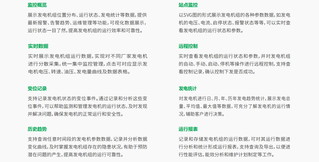 集中監(jiān)控中心可集中監(jiān)控發(fā)電機(jī)的運(yùn)行工況,并將采集的數(shù)據(jù)進(jìn)行存儲,形成歷史報(bào)表、歷史曲線;實(shí)現(xiàn)遠(yuǎn)程參數(shù)設(shè)置、遠(yuǎn)程啟停發(fā)電機(jī);設(shè)備自動化管理,切實(shí)保障應(yīng)急發(fā)電機(jī)的正常運(yùn)行。